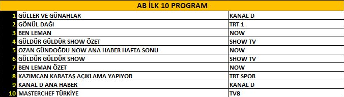 AB kategorisinde de tablo değişmedi. “Güller ve Günahlar” dizisi, güçlü hikâyesi ve istikrarlı izleyici kitlesiyle birinciliği elde ederek zirvedeki yerini korudu. Uzun yıllardır ekranlarda yer alan ve sadık izleyicisiyle dikkatleri üzerine çeken “Gönül Dağı” dizisi ikinci sırada yer alırken, eğlenceli yapısıyla öne çıkan dizi “Ben Leman” ise AB grubunda üçüncü sıraya yerleşerek gecenin dikkat çeken yapımları arasında yer aldı.