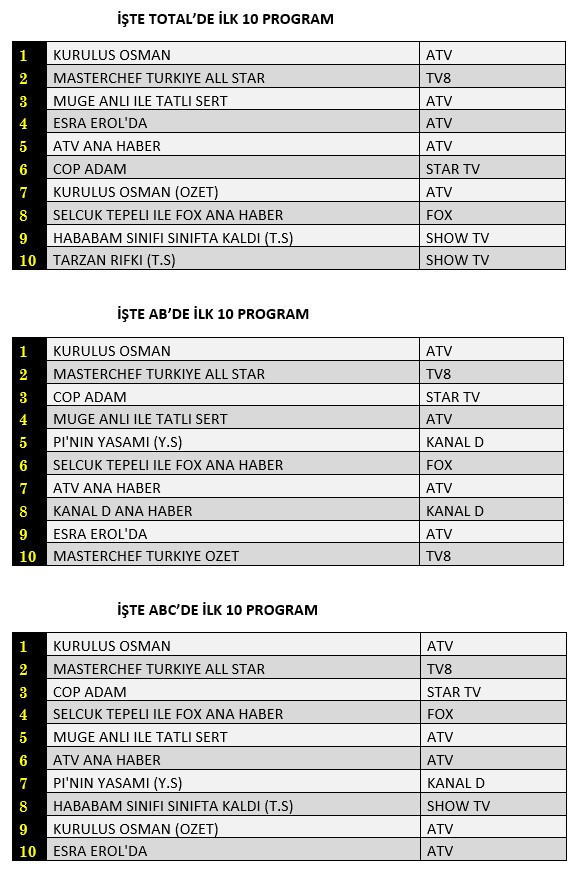 Yapımcıların dikkatle takip ettiği reyting ölçümü olan AB'de ise 1.sırada “Kuruluş Osman”, 2.sırada “Masterchef Türkiye All Star”, 3.sırada Star TV’de yayınlanan “Çöp Adam” yer aldı. 20ABC1'de de benzer bir tablo yaşandı ve liste Kuruluş Osman, Çöp Adam ve MAsterchef şeklinde sıralandı.