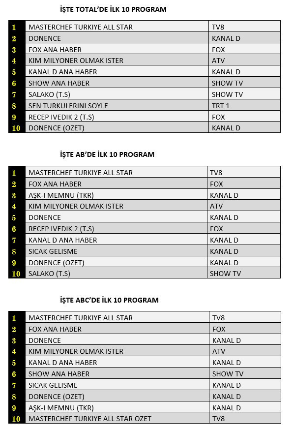 İzley9icilerin bir başka me9rak ettiği teyting ölçümü olan AB'de ise 1.sırada “Masterchef Türkiye All Star”, 2.sırada “Fox Ana Haber”, 3.sırada Kanal D’de tekrar bölümü yayınlanan “Aşk-ı Memnu” yer aldı. ABC1’de ise ilk sırada MasterChef yer alırken onu Fox Haber ve Dönence dizileri takip etti. İşte güne damga vuran reyting listeleri.