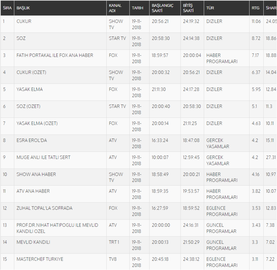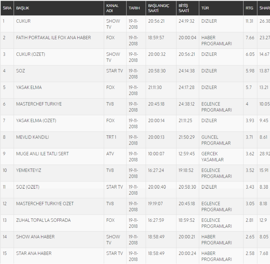 19 Kasım Pazartesi Reyting Sonuçları