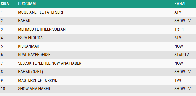 ABC1 seyirci kategorisinde ise zirvenin sahibi, sabah kuşağında uzun senelerdir başarılı bir şekilde ekranlarda yer almaya devam eden ve rakiplerine adeta hiç fırsat tanımayan "Müge Anlı ile Tatlı Sert" programı oldu. Toplumun farklı kesimlerinden gerçek olayları gündeme taşıyan ve yayınladığı her bölümüyle büyük ilgi gören program, bir defa daha seyircisinin güvenini ve beğenisini kazanarak reytinglerde günün en çok izlenen programlarından biri olmayı başardı.