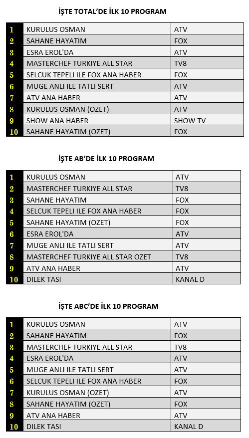 Total reyting kategorisinde zirvenin sahibi, büyüleyici tarihi atmosferiyle 'Kuruluş Osman' oldu. İkinci sıradaki sürükleyici komedi 'Şahane Hayatım' izleyicilerden büyük ilgi gördü. Esra Erol'un duygusal anlarla dolu programı üçüncü sıraya yerleşirken, mutfakta nefes kesen yarışlara sahne olan 'MasterChef Türkiye' dördüncü sıraya konuk oldu. Geceyi beşinci sırada tamamlayan ise Selçuk Tepeli'nin sunumuyla Fox Ana Haber oldu.