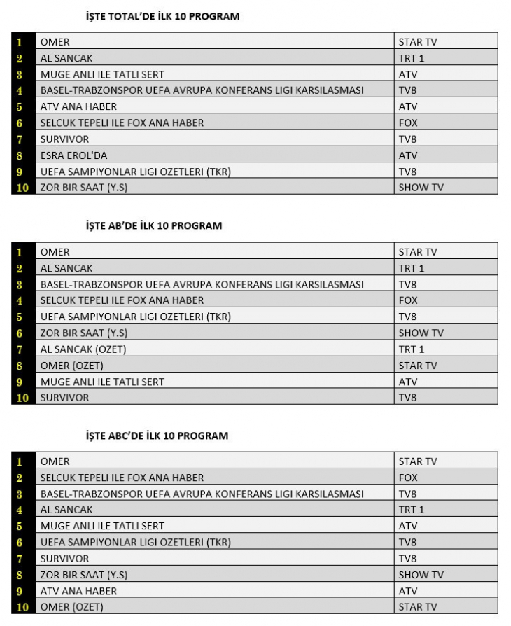 İzleyiciler tarafından merak edilen reyting listesi olan Total’de zirvede Ömer dizisi yer alırken TRT1'de Al Sancak dizisi onu takip etti. 3. sırada Atv’de gündüz kuşağında yayınlanan Müge Anlı ile Tatlı Sert yer aldı. Bir başka reyting sonucu olan AB'de ise benzer bir tablo oluştu. İlk sırada Ömer, 2. Sırada TRT yapımı Al Sancak, 3. sırada TV8’de yayınlanan Basel-Trabzonspor UEFA Avrupa Konferans Ligi Karşılaşması yer aldı. Son olarak ABC1'de ise zirvede Ömer yer alırken 2. Sırada Selçuk Tepil ile Fox Ana haber onu izledi. 3. sırada ise bir rövanş karşılaşması olan Basel-Trabzonspor UEFA Avrupa Konferans Ligi Karşılaşması yer aldı.