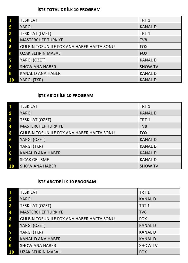 ABC kategorisinde de ilk 5'te değişiklik yaşanmadı. Böylece 'Teşkilat' dizisi tüm reyting kategorilerinde günü birinci sırada tamamlarken, Kanal D'nin yeni dizisi 'Yargı' ikinci bölümüyle izleyiciden tam not alarak günü tüm kategorilerde ikinci sırada tamamladı.