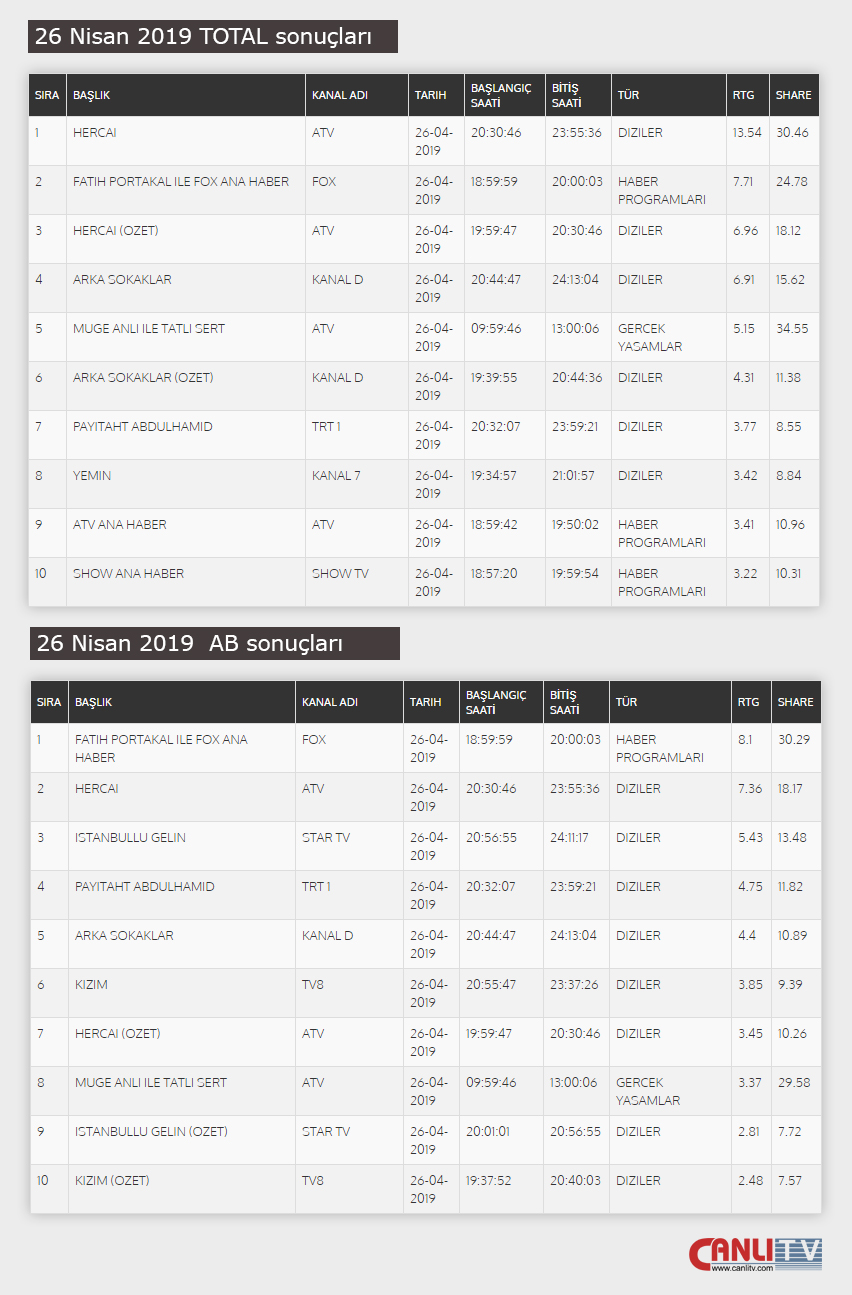 26 Nisan Cuma Reyting Sonuçları