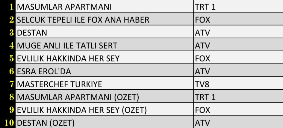 ABC1 grubunda ise bu sıra tamamen değişti. ABC1'de günün en çok izlenen programı 'Masumlar Apartmanı' birinci oldu. 'Selçuk Tepeli ile Fox Ana Haber' ikinci, 'Destan' üçüncü sırada yer alırken, 'Evlilik Hakkında Her Şey' beşinci sırada günü tamamladı. İşte AB, TOTAL ve ABC reyting sonuçlarının ilk 10 listesi..