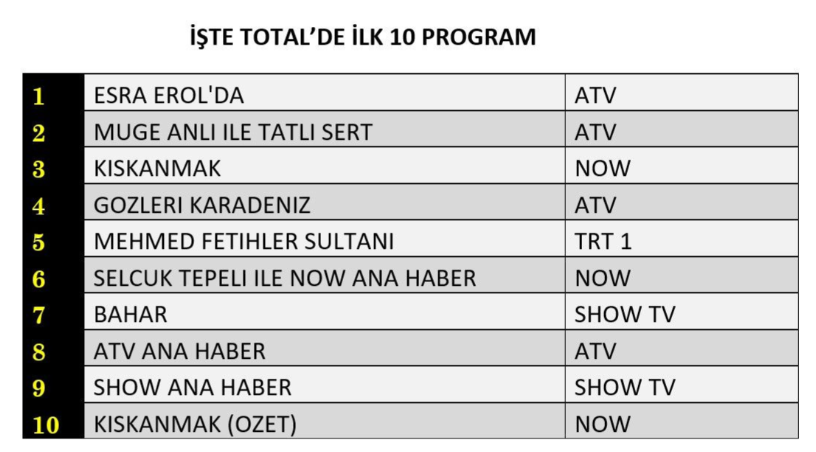 Atv'nin uzun soluklu yapımlarından biri olan "Esra Erol'da" programı hem eğlence hem de duygusal yönüyle izleyiciden tam not alarak reyting listelerinin değişmeyen lideri olmayı devam ettirdi.