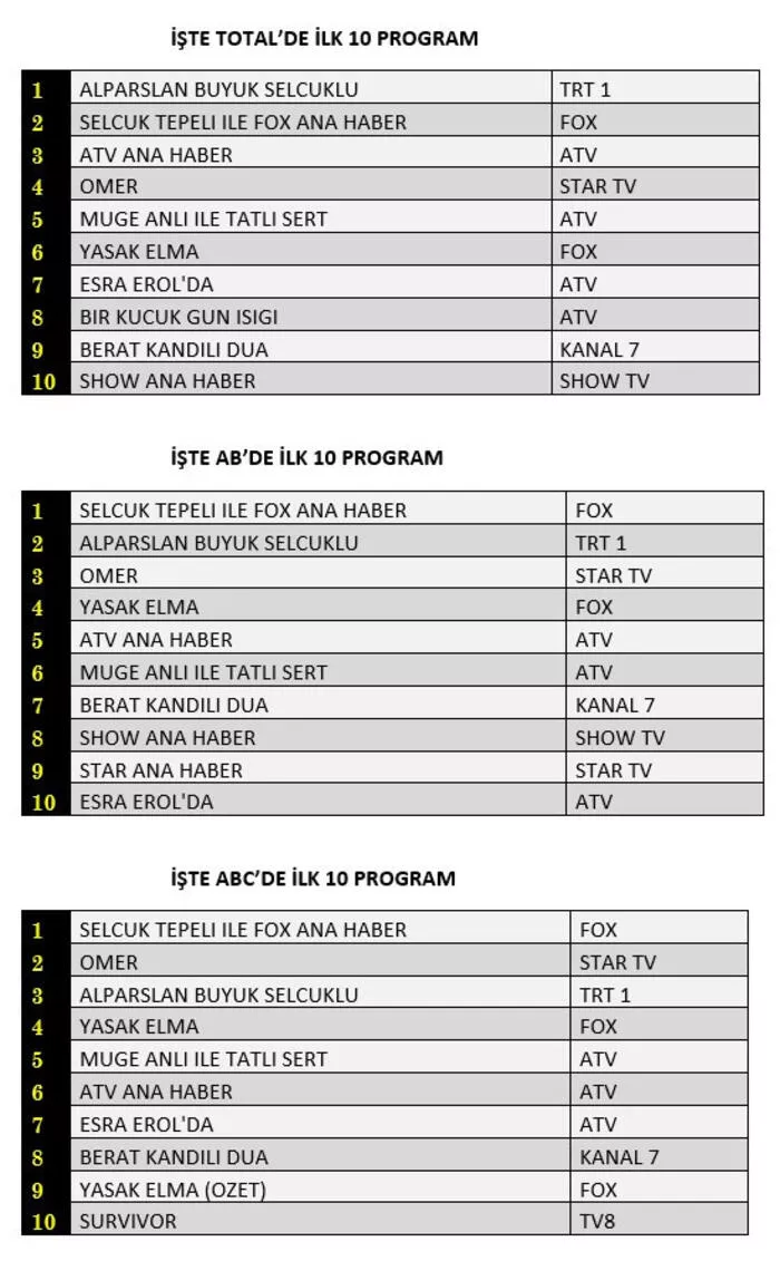 Oyuncular ve yapımcıların dikkatle takip ettiği reyting ölçümü olan AB'de ise zirveye “Selçuk Tepeli İle Fox Ana Haber” damga vurdu. Pazartesi günlerinin açık ara lideri “Alparslan Büyük Selçuklu” 2. Sıraya yerleşirken her bölümünde reytinglerinin yükselten Star TV’de yayınlanan “Ömer” 3. Sıradaki yerini korudu. Son olarak ABC1’de benzer bir tablo yaşandı. “Selçuk Tepeli İle Fox Ana Haber” zirvede yer alırken onu Ömer dizisi takip etti. Alparslan Büyük Selçuklu ise ilk 3’teki yerini korudu.