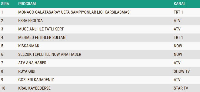 Total grubunda açıklanan sonuçlara göre geceye damgasını vuran yapım “Monaco–Galatasaray UEFA Şampiyonlar Ligi Karşılaşması” oldu. Futbol heyecanının zirveye çıktığı mücadele, yüksek izlenme oranıyla günün birincisi olarak listeye giriş yaptı.