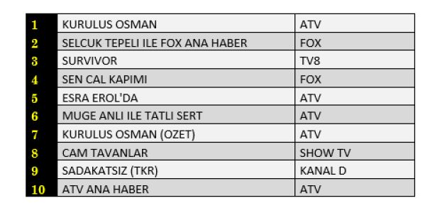 Not: TİAK'ın aldığı karar nedeniyle reyting sonuçlarının detaylarını ve ilk 100 program sıralamasını yayınlayamıyoruz.
