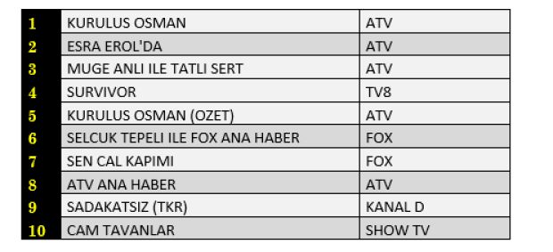 Total'de dün en çok izlenen program Atv'de yayınlanan 'Kuruluş Osman' oldu. Listenin ikinci sırasında 'Esra Erol'da', üçüncü sırasında ise 'Müge Anlı ile Tatlı Sert' yer aldı. Böylece Atv kanalı total'de ilk 3'e 2 program ve bir dizisinin sokmayı başardı. Listenin devamında 'Survivor' dördüncü, 'Kuruluş Osman' özet bölümü beşinci sırada yer aldı. Günün diğer prime time dizileri 'Sen Çal Kapımı' yedinci, ilk bölümüyle yayınlanan 'Cam Tavanlar' ise onuncu sırada günü tamamladı.