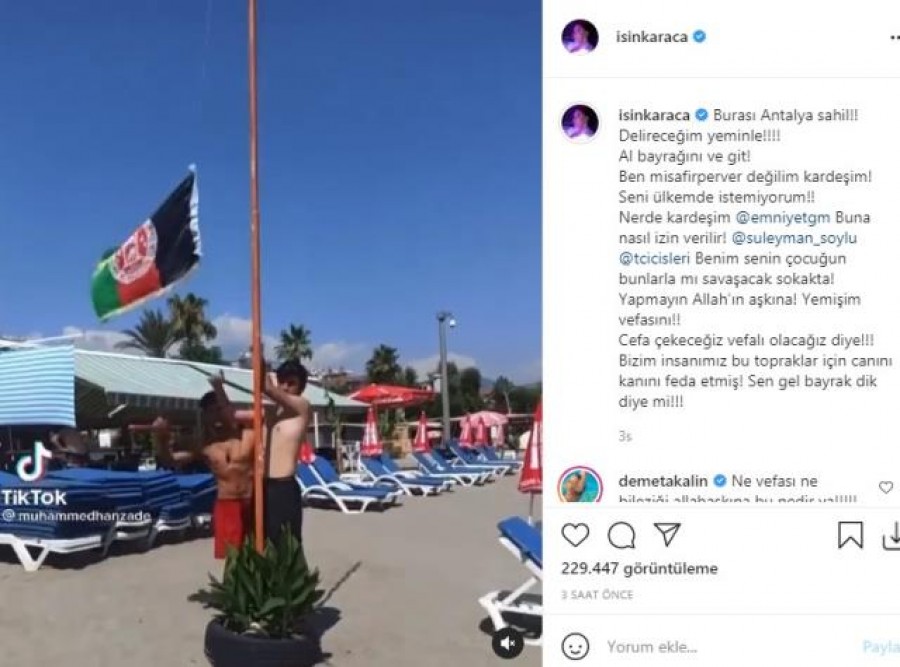 Sosyal medyada yapılan paylaşımda, videoda yer alan Afgan mülteciler Türkiye'de bir plajda Afganistan bayrağını asmakta. Ve bunu sosyal medyada paylaşan mülteci, büyük tepkiye yol açtı. Bu videoya tepki gösterenler arasında Işın Karaca'da yer aldı. İşte Işın Karaca'nın Afgan mültecilere karşı gösterdiği tepki,