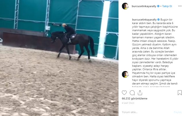 Burcu Çetinkaya sosyal medya hesabında yayınladığı başı açık bir şekilde ata binme videosunu takipçileri ile paylaşarak bu kararını duyurdu. Takipçilerinin büyük bir şok içerisinde izlediği bu videonun açıklamasına da, "Bugün bir karar aldım ben. Bu kararda asla 6 yıldır taşımaya çalıştığım başörtüsüne inanmamak ve saygısızlık yok. Bu kadar yapabildim. Aldığım kararı tamamen manevi yaşamak istedim. Hatta imkanım olsa idi sessizce. Nasip. Bu süreçte benden güç alanlar olduysa onları istemeden kırdıysam özür dilerim.