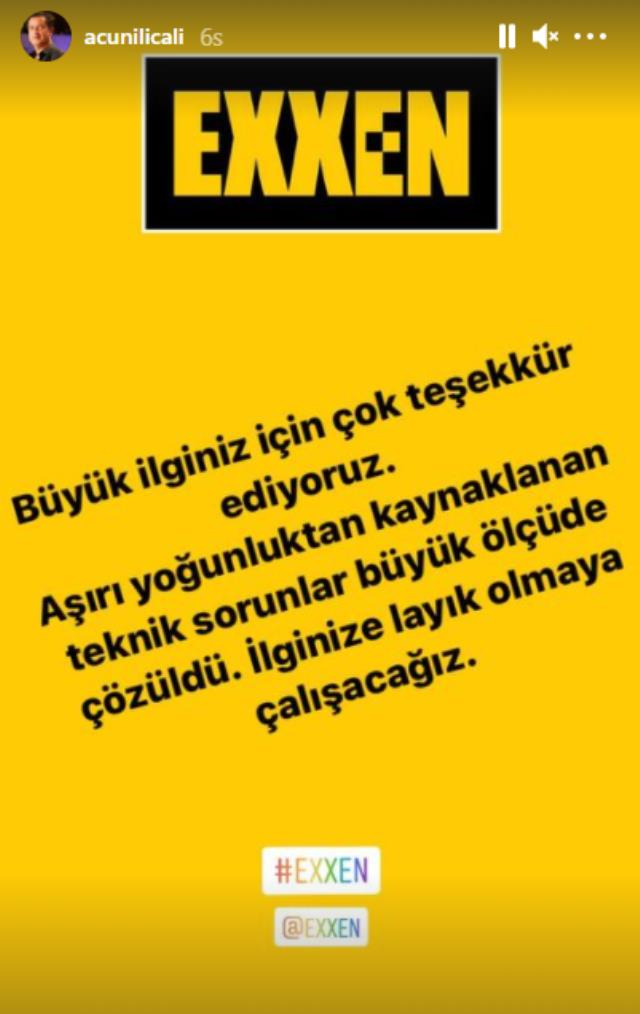 Çok eleştirilen Exxen ile ilgili Acun Ilıcalı’dan ilk açıklama geldi. Platformda yaşanan sorunları, kullanıcı yoğunluğuna yükleyen Ilıcalı, sosyal medya hesabı üzerinden yaptığı açıklamada “İlginize layık olmaya çalışacağız” dedi. Açıklamanın ardından kullanıcıların tepkileri ise gecikmedi.