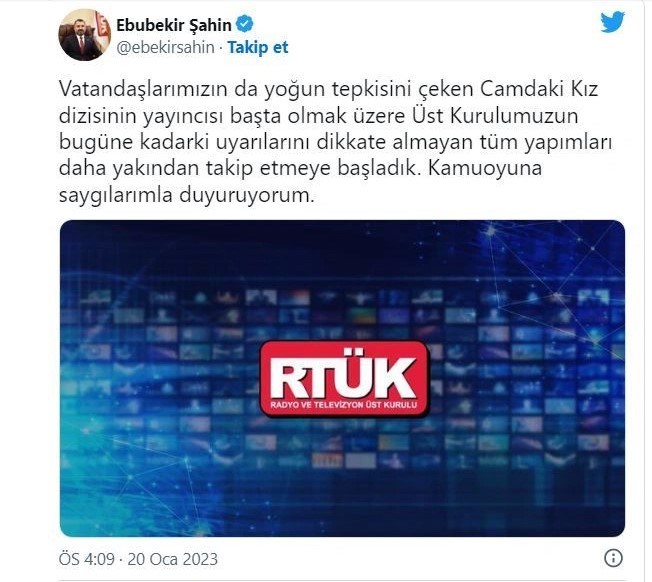 Radyo ve Televizyon Üst Kurulu Başkanı Ebubekir Şahin sosyal medya hesabından yaptığı açıklamada “Vatandaşlarımızın da yoğun tepkisini çeken Camdaki Kız dizisinin yayıncısı başta olmak üzere Üst Kurulumuzun bugüne kadarki uyarılarını dikkate almayan tüm yapımları daha yakından takip etmeye başladık. Kamuoyuna saygılarımla duyuruyorum.” dedi.