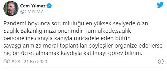 Cem Yılmaz paylaşımında, "Pandemi boyunca sorumluluğu en yüksek seviyede olan Sağlık Bakanlığımıza önerimdir. Tüm ülkede, sağlık personeline, canıyla kanıyla mücadele eden bütün savaşçılarımıza moral toplantıları söyleşiler organize ederlerse hiç bir ücret almamak kaydıyla katılmayı görev bilirim" ifadelerini kullandı. Yılmaz'ın paylaşımı sosyal medyada hızla yayıldı ve çok sayıda beğeni ve yorum yapıldı.