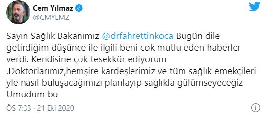 Sağlık Bakanı Fahrettin Koca'nın Cem Yılmaz'ın teklifine olumlu cevap verdiğini ise yine Yılmaz kendi sosyal medya hesabından paylaştı. Cem Yılmaz konuyla ilgili attığı ikinci twitte, "Sayın Sağlık Bakanımız Fahrettin Koca, bugün dile getirdiğim düşünce ile ilgili beni çok mutlu eden haberler verdi. Kendisine çok tesekkür ediyorum. Doktorlarımız, hemşire kardeşlerimiz ve tüm sağlık emekçileriyle nasıl buluşacağımızı planlayıp sağlıkla gülümseyeceğiz. Umudum bu…" açıklamasında bulundu.