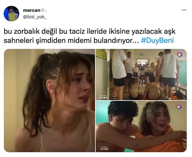 O sahneler çok konuşuldu, Duy Beni dizisinde iki lise öğrencisine arkadaşları tarafından yapılanlar izleyicileri öfkelendirdi. Star TV’de ekrana gelen Duy Beni’de, orta sınıf ailelerin çocuklarından, bursla özel okulda okuyan iki genç, kendisini okulda istemeyen diğer arkadaşları tarafından herkesin içinde soyularak kamera kaydına alındı. O şiddet dolu sahneler kısa sürede Twitter’da gündem olurken, tepkiler de beraberinde geldi. Zorbalık içeren o sahnelere kullanıcılar, ‘Çocukların bilinçaltına ne koymaya çalışıyorsunuz?’ ve ‘Senaristler ne yaptığının farkında mı?’ yorumlarında bulundu.