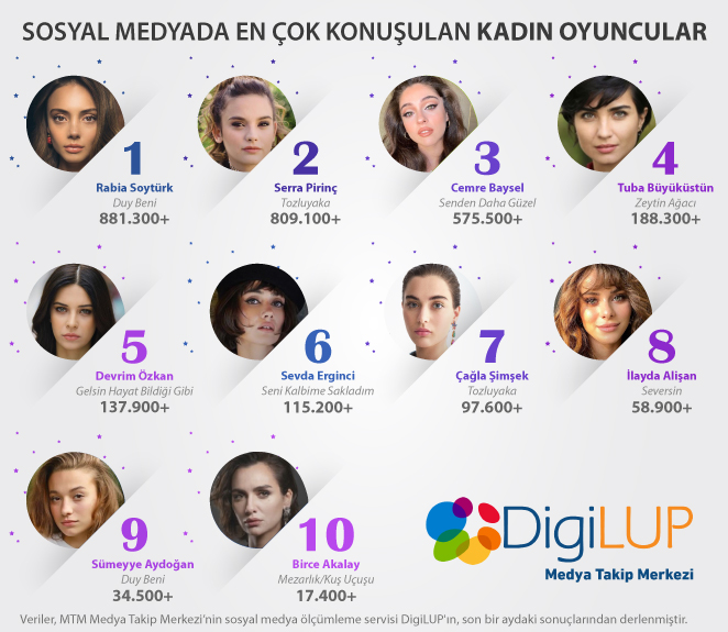 DigiLUP Top 10 sıralamasında 881.300 oyla ilk sıraya yerleşen Rabia Soytürk gün geçtikçe artan başarısını perçinledi. Listede Tuba Büyüküstün, Birce Akalay, Serra Pirinç gibi usta oyuncuları geride bırakan genç oyuncu kendini geliştirmenin semeresini almaya başladı. B1 Ağustos- 1 Eylül arası 31 günlük süreyi araştıran DigiLUP Top 10 sıralamasında Rabia Soytürk’ü, Serra Pirinç ile Cemre Baysel takip etti. Listede gençlerin ağırlıklı yer almasının sebebi ise yaz dizileri sayesinde ekranda izleyiciyle buluşmaları olarak gösterildi. Sosyal medyayı aktif kullanan genç oyuncular bu sayede binlerce yorum alabiliyor. Dijital platformlardaki dizilerde rol alan Tuba Büyüküstün ve Birce Akalay da yer aldığı listede var.