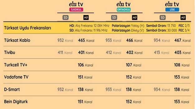 Türkiye'de MEB'e bağlı okullarda 8 binin üstünde öğrenci bulunuyor. Öğretmen ve velilerin de aktif kullanması gereken EBA sistemi ile önemli bir alt yapıya gereksinim duyuldu. Birçok ilde internet ve internete erişim açısından sıkıntılar yaşanmaması için televizyon yayını daha kapsayıcı bir çözüm oldu. MEB, kurtuğu altyapı ile EBA TV üzerinden yayın yapmaya başladı. İnternetten de erişim sağlanabilen EBA TV verilen freksanslarla izlenebiliyor. İlkokul, Ortaokul ve Lise öğrencilerine yönelik hazırlanan ders programlarına göre EBA TV bugün yayına başladı. İlk gün olması sebebiyle öğrencilerin bazıları dersleri izlemede problem yaşasa da ders yayınları binlerce öğrenciye ulaştı. EBA TV gün boyu yayın yaparak derslerin tekrar izlenmesini sağlıyor. İşte EBA TV'nın yayın frekansları;