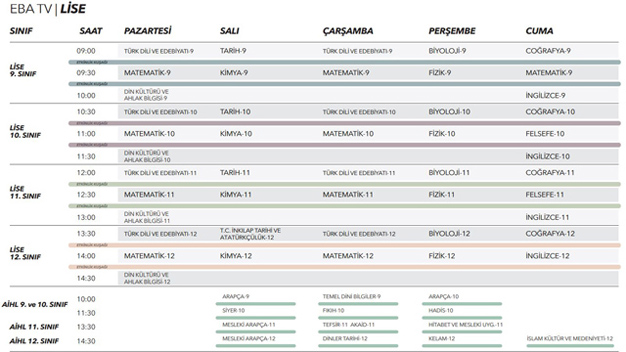EBA TV HAFTALIK DERS PROGRAMI