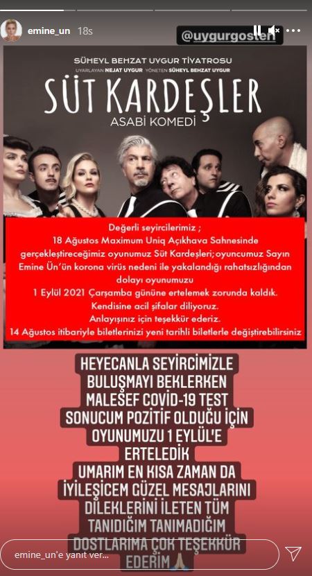Koronavirüse yakalanan ünlüler arasına Emine Ün de katıldı. Ünlü oyuncu planlanan tiyatro gösterisine günler kala koronavirüse yakalandı. Yapılan testler sonucu Covid- 19 salgınına yakalandığı anlaşılan Emine Ün dinlenmeye çekildi. 'Süt Kardeşler' oyununda yer alan Ün'ün hastalanması planlanan gösteri tarihinin değişmesine yol açtı. Ertelenen oyunun yeni tarihi oyunun yönetmeni Behzat Uygur'un ve Uygur Gösteri sosyal medya hesaplarından paylaşıldı. O paylaşımda, "Değerli seyircilerimiz ; 18 Ağustos Maximum Uniq Açıkhava Sahnesinde gerçekleştireceğimiz oyunumuz 'Süt Kardeşler'i, oyuncumuz Sayın Emine Ün'ün koronavirüs nedeniyle yakalandığı rahatsızlığından dolayı 1 Eylül 2021 Çarşamba gününe ertelemek zorunda kaldık. Kendisine acil şifalar diliyoruz. Anlayışınız için teşekkür ederiz. Ağustos itibariyle biletlerinizi yeni tarihli biletlerle değiştirebilirsiniz" ifadeleri kullanıldı.
