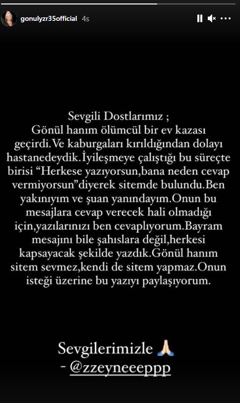 Gönül Yazar hayranlarını endişelendiren kaza sosyal medya hesabından yapılan paylaşımla duyuruldu. Gönül Yazar'ın isteği ile bu paylaşımı yaptığını belirten kullanıcı, Yazar'ın kendi İnstagram hesabından bir hikaye paylaştı. O paylaşımda, "Sevgili dostlarımız; Gönül hanım ölümcül bir ev kazası geçirdi. Ve kaburgaları kırıldığından dolayı hastanedeydik. İyileşmeye çalıştığı bu süreçte birisi "Herkese yazıyorsun, bana neden cevap vermiyorsun" diyerek sitemde bulundu. Ben yakınıyım ve şuanda yanındayım. Onun bu mesajlara cevap verecek hali olmadığı için yazılarınızı ben cevaplıyorum. Bayram mesajını bile şahıslara değil, herkesi kapsayacak şekilde yazdık. Gönül hanım sitem sevmez, kendi de sitem yapmaz. Onun isteği üzerine bu yazıyı paylaşıyorum" ifadeleri kullanıldı.