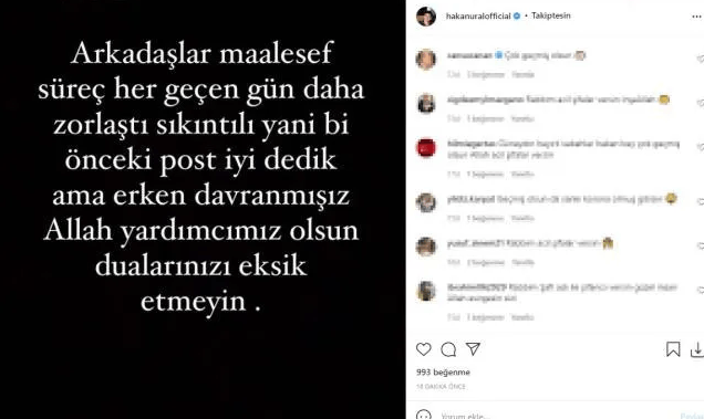 Hakan Ural daha sonra yeni bir paylaşım yaparak sağlık durumunun ağırlaştığını duyurdu. Sevenlerini endişelendiren paylaşımda Hakan Ural, "Arkadaşlar maalesef süreç her geçen gün daha zorlaştı. Sıkıntılı yani. Bir önceki post iyi dedik ama erken davranmışız. Allah yardımcımız olsun dualarınızı eksik etmeyin" notunu yazdı. Hakan Ural'ın paylaşımına birçok ünlü isim yorum yazarak geçmiş olsun dileklerinde bulundu. Hakan Ural'ın hastalığının sebebi ise henüz açıklanmadı. Ünlü isim Hakan Ural'ın tedavisine devam ediliyor. Soğuk algınlığı nedeniyle tedavi gören Hakan Ural'ın sağlığına bir an önce kavuşması için sevenleri ve takipçileri dua içeren yorumlar yapmaya devam ediyor.