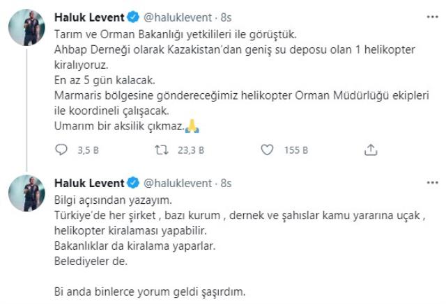 Bu güne dek bir çok yardıma muhtaç ailenin sesi olan ve herkesin takdir ettiği ünlü şarkıcı Haluk Levent, bu seferde afet bölgesinde yardımlarına devam etmekte. Günlerdir afetzedelere yardımlarını ulaştıran sanatçı ve ekibi şimdi ise yangın söndürme çalışmaları için helikopter kiralayarak destek oldu.