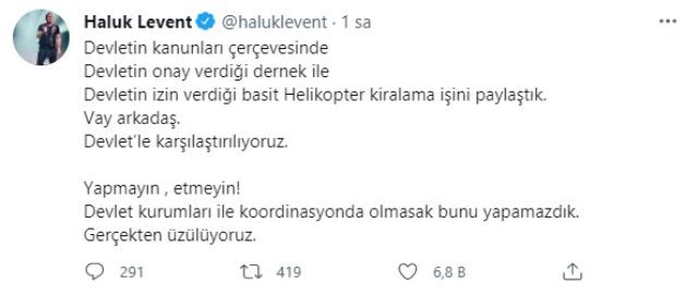 Haluk Levent'in yaptığı paylaşımların ardından yorumlarda sanatçı ile devleti kıyaslayanlar oldu. Bu durumun üzerine sessiz kalmayan Haluk Levent, 'Devletin kanunları çerçevesinde. Devletin onay verdiği dernek ile. Devletin izin verdiği basit Helikopter kiralama işini paylaştık. Vay arkadaş. Devletle karşılaştırılıyoruz. Yapmayın , etmeyin! Devlet kurumları ile koordinasyonda olmasak bunu yapamazdık. Gerçekten üzülüyoruz' sözlerini kullanarak konuya açıklık getirdi.