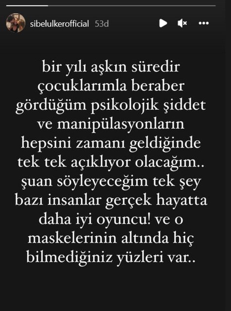 Sibel Ülker sosyal medyasından yaptığı açıklama da; ‘’Bir yılı aşkın süredir çocuklarımla beraber gördüğüm psikolojik şiddet ve manipülasyonların hepsini zamanı geldiğinde tek tek açıklıyor olacağım. Şu an söyleyeceğim tek şey; bazı insanlar gerçek hayatta daha iyi oyuncu ve o maskelerin altına hiç bilmediğiniz yüzleri var.’’ Dedi.