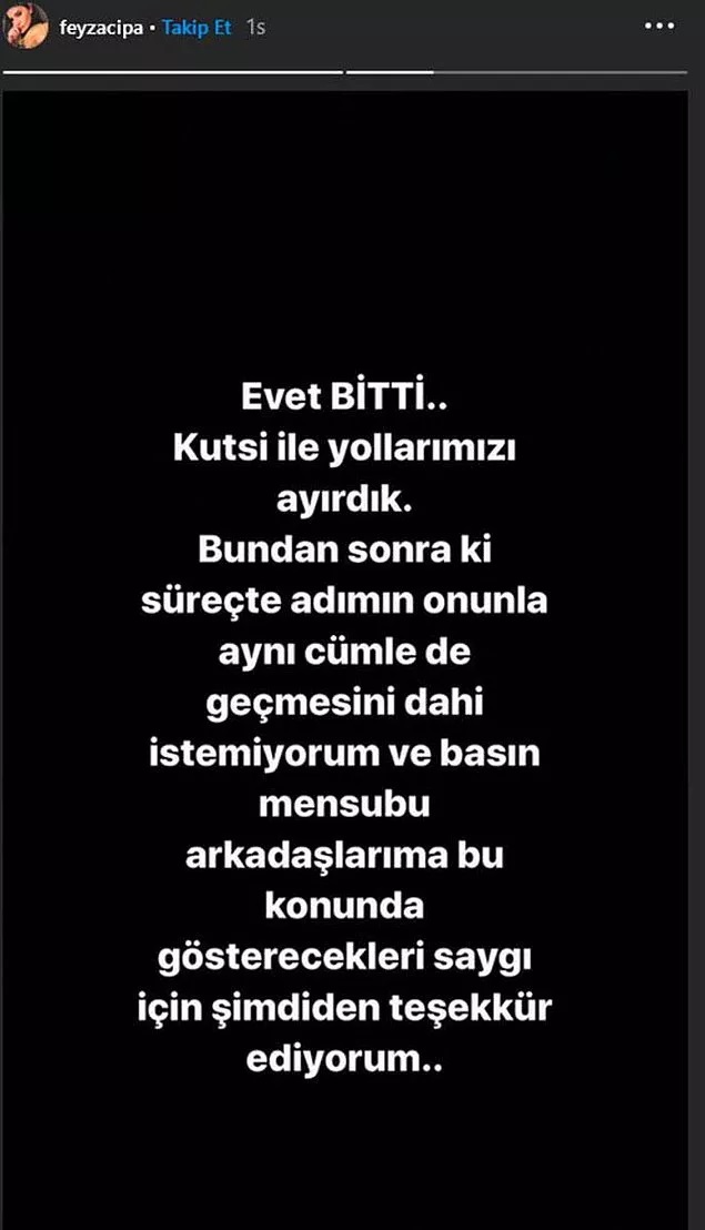 Bu kez açıklamasında; ‘’Dünkü yaptığım paylaşım tamamen yanlış anlaşılmıştır. Paylaşımımda sevgili eşim Kutsi’nin ismi dahi geçmemiştir. Kendisiyle boşanmadığımız gibi böyle bir durum söz konusu dahi değildir. Konu zaten Kutsi ile evli olduğum için etraftan yapılan manipüle ve baskılarla alakalıdır. Yüzlerinde bir maskeyle bana oyuncuları taş çıkartan performans sergileyip arkamdan çevreler işlerdir. Gizli olan Instagram sayfamdan yaptığım bu paylaşımı böyle yorumlanarak yayılmasına ve gündemi meşgul etmesine üzgünüm.’’ Sözlerine yer verdi.