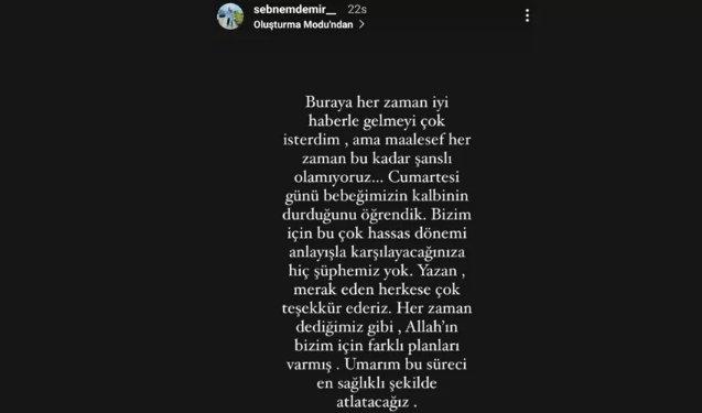 Mert Ramazan Demir’in yengesi Şebnem Demir sosyal medya hesabından acı haberi paylaştı. Instagram hesabından acılı haberi mesaj olarak paylaşan ünlü oyuncunun yengesi :” Buraya her zaman iyi haberle gelmeyi çok isterdim ama maalesef her zaman bu kadar şanslı olamıyoruz. Cumartesi günü bebeğimizin kalbinin durduğunu öğrendik. Bizim için bu çok hassas dönemi anlayışla karşılayacağınızı hiç şüphemiz yok. Yazan, merak eden herkese çok teşekkür ederiz. Her zaman dediğimiz gibi Allah'ın bizim için farklı planları varmış. Umarım bu süreci en sağlıklı şekilde atlatacağız" diyerek üzüntülerini dile getirdi.