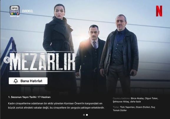 Başrollerini Birce Akalay, Olgun Toker ve Şehsuvar Aktaş’ın paylaştığı kadrosunda; Hakan Meriçliler, Berna Öztürk, Sezgin Uzunbekiroğlu, Cem Sürgit, Baran Güler, Elif Sevinç gibi isimlerin yer aldığı ANS Productions ve Evrensel Film ilk sezonuyla dijital platform Netflix’te yayınlanacak olan Mezarlık dizisinin afişi ve fragmanı yayınlandı.