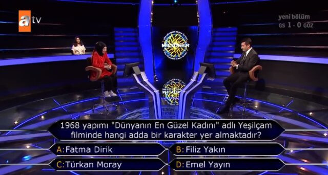 Haftada iki gün Atv ekranlarında yayınlanan 'Kim Milyoner Olmak İster'deki Yeşilçam sorusu yine çok konuşuldu. Ünlü oyuncu Kenan İmirzalıoğlu'nun sunduğu yarışmada "1968 yapımı 'Dünyanın En Güzel Kadını' adlı Yeşilçam filminde hangi adda bir karakter yer almaktadır?" sorusu internette yoğun araştırmalara neden oldu. Yarışmacının şok olduğu ve “Bu gerçek mi?” diyerek tepki gösterdiği soru ve cevabı haberimizde.