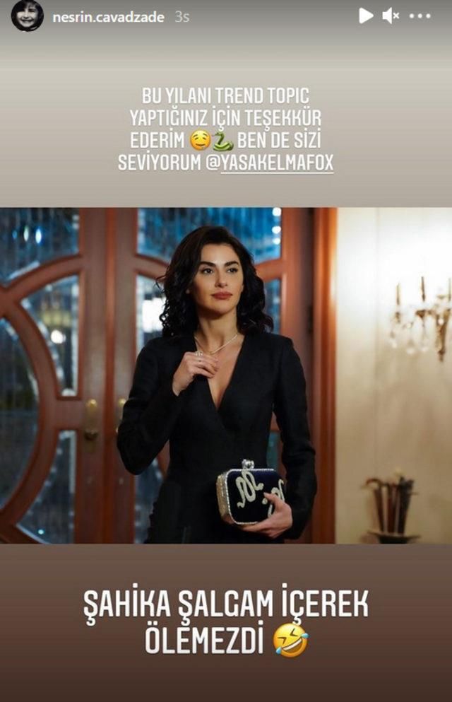 Neyse ki Yasak Elma’nın yeni bölüm fragmanı yayınlandı ve kuşkular cevap buldu. Adana ilimize mahsus şalgam içerek rahatsızlanan Şahika, öldüğü far edilerek halıya sarılmış, akabinde denize atılmıştı. Yasak Elma'nın yayınlanan final sahnesinde Şahika geri döndü. Bunun üzerine Nesrin Cavadzade'den güldüren Yasak Elma yorumu geldi. "Bu yılanı trend topic yaptığınız için teşekkür ediyorum. Ben de sizi seviyorum. Şahika şalgam içerek ölemezdi"