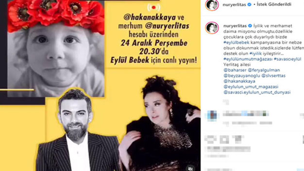 Bu yılın başlarında beyin kanseri sebebiyle hayatını kaybeden ünlü modacı Nur Yerlitaş’ın ailesi ünlü isim adına bir sosyal yardım kampanyasına imza attı. SMA hastası Eylül Bebek adına düzenlenen yardım kampanyasına ünlü isme ait 100 parça eşyanın satışının yapılmasıyla başlandı. Ünlü modacı Nur Yerlitaş’ın ailesi ünlü ismin eşyalarını onun anısına SMA hastası Eylül için bağışladı. Dün akşam gerçekleştirilen yardım kampanyası Hakan Akkaya’nın İnstagram hesabı üzerinden gerçekleştirildi. Konuyla ilgili ünlü modacının İnstagram hesabından bir paylaşım yapıldı. Paylaşımda “Şefkat sevgiden daha büyüktür. Koşulsuz sevgi olarak bilinir. İkincisi Nezaket saygıdan daha büyüktür. İncitmeden sonuç almayı sağlar” sözlerine yer verildi. Ayrıca paylaşımda Nur Yerlitaş yatakta istirahat ederken görülüyor. Paylaşımda ünlü modacı için “bütün gelen misafirlere, arkadaşlarına çok teşekkür ediyorum” ifadeleri kullanıldı.