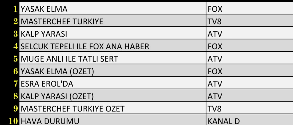 ABC1 reyting grubunda ise durum şöyle; 'Yasak Elma' birinci, 'MasterChef Türkiye'ikinci, 'Kalp Yarası' üçüncü sırada yer alan yapımlar oldu.