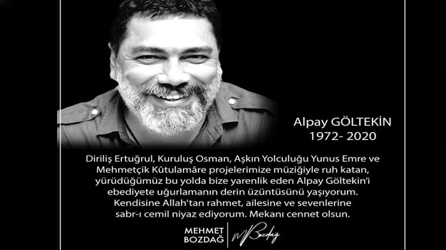 Kiralık Aşk, Poyraz Karayel, Diriliş Ertuğrul, savaşçı, Kuruluş Osman Mehmetçik Kutulamare gibi pek çok yapımın müziklerini yapan ünlü müzisyen Alpay Göltekin bugün hayatını kaybetti. Bir süredir beynindeki tümör sebebiyle yoğun bakımda tedavi gören Göltekin’in vefat haberini Kuruluş Osman ve Diriliş Ertuğrul’un yapımcısı Mehmet Bozdağ sosyal medya hesabından paylaştı. Bozdağ paylaşımında “Diriliş Ertuğrul, Kuruluş Osman, Aşkın Yolculuğu Yunus Emre ve Mehmetçik Kutulamare projelerimize müziğiyle ruh katan Alpay Göltekin’i ebediyete uğurlamanın derin üzüntüsünü yaşıyorum. Kendisine Allah’tan rahmet, ailesine ve sevenlerine sabır niyaz ediyorum. Mekanı cennet olsun” ifadelerini kullandı. Aynı zamanda oyuncu Zeki Alasya’nın müzisyen kızı Zeynep Alasya’nın da eşi olan Göltekin 48 yaşında hayata veda etti.