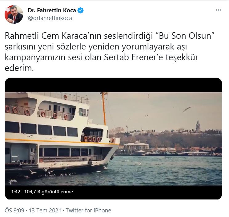 Sertap Erener'in seslendirdiği şarkı ve hazırlanan kliple vatandaşları aşı olmaya teşvik etti. Sağlık Bakanı Fahrettin Koca ise bu klibi paylaştı. Koca twitter hesabından yaptığı paylaşımına, "Rahmetli Cem Karaca’nın seslendirdiği “Bu Son Olsun” şarkısını yeni sözlerle yeniden yorumlayarak aşı kampanyamızın sesi olan Sertab Erener’e teşekkür ederim" notunu ekledi. Erener'in yorumladığı Bu Son Olsun şarkısı, aşı olmaya giden bir vatandaşın rol aldığı anlamlı bir kliple verildi. Hazırlanan klipte iş yerlerinin açılması, sevdiklerimizle rahatça görüşebilmek ve sokaklarda özgürce dolaşabilmek için aşı olmak gerektiği teması işlendi. Fahretten Koca'nın da paylaşımıyla Sertap Erener'in seslendirdiği şarkı sosyal medyada kısa sürede çok sayıda gösterim aldı.