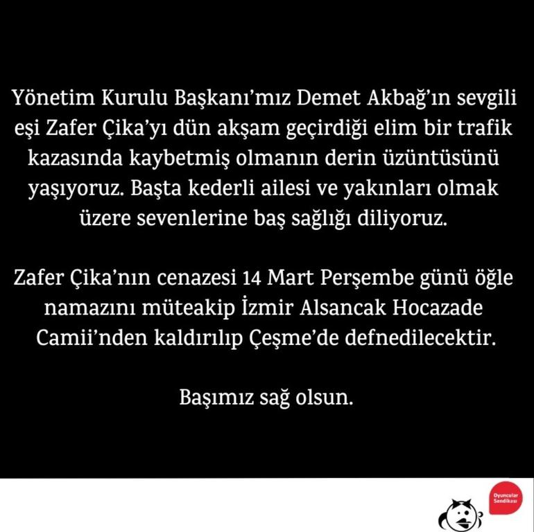 Demet Akbağ'ın Meltem Cumbul'dan devralmış olup yönetim kurulu başkanlığını yaptığı Oyuncular Sendikası ani ölü haberini ve cenaze detaylarını duyurdu.