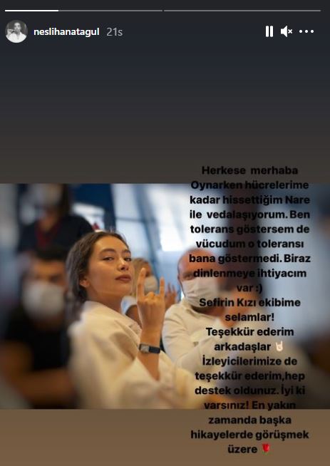 Sefirin Kızı dizisinin sevilen başrol oyuncusu Neslihan Atagül Doğulu, dizide Nare karakterini canlandırıyordu. Neslihan Atagül geçen hafta rahatsızlanmış ve geçirgen bağırsak sendromu yaşaması sebebiyle bir süre setlere ara verdiğini açıklamıştı. Neslihan Atagül dün sosyal medya hesabından paylaştığı notta, "Herkese merhaba. Oynarken hücrelerime kadar hissettiğim Nare ile vedalaşıyorum. Ben tolerans göstersem de vücudum o toleransı bana göstermedi. Biraz dinlenmeye ihtiyacım var. Sefirin Kızı ekibine selamlar! Teşekkür ederim arkadaşlar. İzleyicilerimize de teşekkür ederim, hep destek oldunuz. İyi ki varsınız! En yakın zamanda başka hikayelerde görüşmek üzere" ifadelerini kullanmıştı.