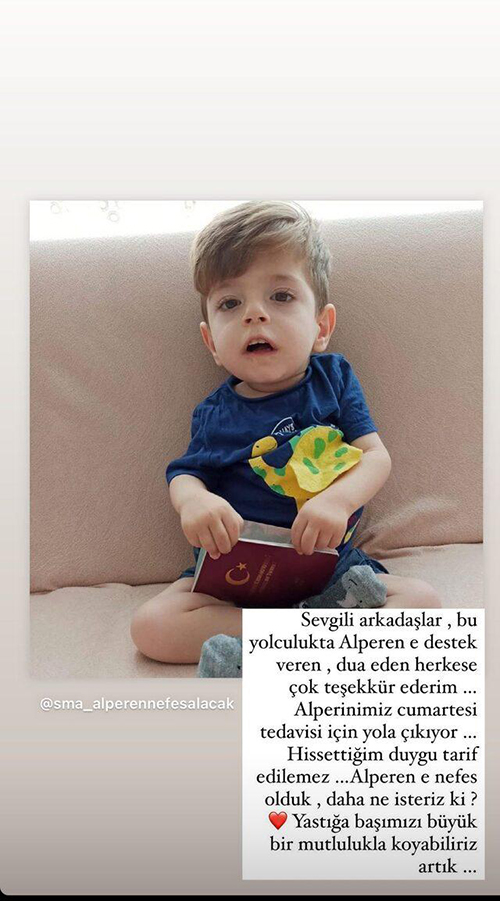 Bu sezon İbrahim Çelikkol ile başrol oynadığı "Doğduğun Ev Kaderindir" dizisi ekibiyle birlikte, SMA hastası Alperen için kampanya düzenleyen Demet Özdemir, nihayet emeğinin karşılığını aldı. Uzun süredir tedavi parasının toparlanabilmesi için çabalayan ünlü oyuncu gereken parayı toparlayabildi. Kendisinin başlattığı ve sürekli destek verdiği kampanyanın nihayet amacına ulaştığını duyurmak da yine ünlü oyuncuya düştü. "Hissettiğim duygu tarif edilemez..." diyen Demet Özdemir, emeği geçen herkese teşekkür etti. Alperen bebeğin tedaviye olumlu cevap vermesi ülkemizde bu amansız hastalıkla boğuşan binlerce SMA hastalarına umut olacak.