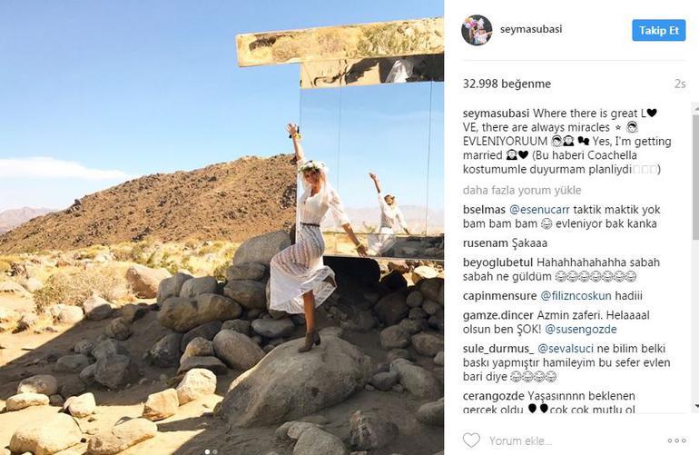 Uzun bir süredir Acun Ilıcalı le ilişkisini sürdüren Şeyma Subaşı Instagram hesabından evleneceklerine dair müjde verdi. İngilizce kelimelerle, Büyük aşkın olduğu yerde her zaman mucizeler vardır' sözlerini ekleyen Subaşı, takpçilerinden çok sayıda mesaj aldı.