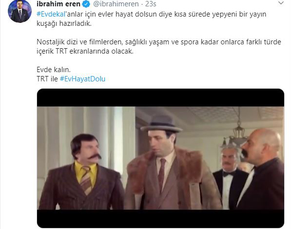 TRT Genel Müdürü İbrahim Eren, "Evdekal'anlar için evler hayat dolsun diye kısa sürede yepyeni bir yayın kuşağı hazırladık. Nostaljik dizi ve filmlerden, sağlıklı yaşam ve spora kadar onlarca farklı türde içerik TRT ekranlarında olacak. Evde kalın. TRT ile EvHayatDolu" şeklinde bir videolu paylaşım yaptı. Eren'in paylaşımında Yeşilçam'ın unutulmaz filmleri, eskiz dizi filmler ve unutulmayan spor müsabakaları yer aldı.
