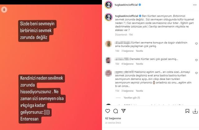 Şarkıcı Tuğba Ekinci’nin yaptığı sosyal medya paylaşımı tartışmalara neden oldu. İnstagram üzerinden yaptığı paylaşımda “Ben Kürtleri sevmiyorum. Birbirimizi sevmek zorunda değiliz. Sizi sevmeyen olduğunda küfür kıyamet neden? Sizi sevmeyeni siz de sevmezsiniz olur biter. Eğitim şart dedirtmekte üstünüze yok. Sevilip sevilmemenin ırkçılıkla ne alakası var?” diyen Ekinci’ye tepkiler dinmiyor. Daha sonra "Siz de beni sevmeyin, birbirimizi sevmek zorunda değiliz" diye devam eden Tuğba Ekinci, paylaşımını şöyle bitirdi: "Kendinizi neden sevilmek zorunda hissediyorsunuz. Ne zaman sizi sevmeyen olsa ırkçılığa kadar geliyorsunuz. Enteresan...".jpg)
