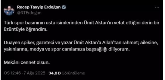 Cumhurbaşkanı Recep Tayyip Erdoğan’da yayınladığı taziye mesajında "Türk spor basınının usta isimlerinden Ümit Aktan'ın vefat ettiğini derin bir üzüntüyle öğrendim. Duayen spiker, gazeteci ve yazar Ümit Aktan'a Allah'tan rahmet; ailesine, yakınlarına, medya ve spor camiamıza başsağlığı diliyorum. Mekanı cennet olsun"dedi.