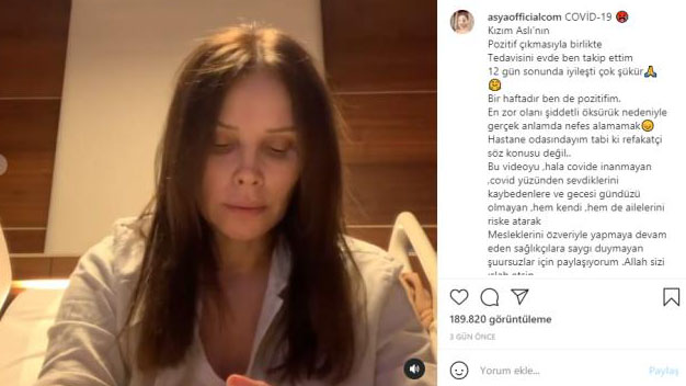 Magazin basını ve sosyal medya 90’lı yıllara damgasını vuran ve geçtiğimiz günlerde koronavirüse yakalanan ünlü isim Asya’nın durumunun ağırlaşması üzerine hastaneye kaldırılmasıyla bir kez daha şok oldu. Halen hastanelerde binlerce insanın tedavisi görülürken her geçen gün artan koronavirüse yakalanan Asya sosyal medya hesabından bir paylaşımda bulundu. Ünlü isim “kızım Aslı’nın pozitif çıkmasıyla birlikte tedavisini evde ben takip ettim. 12 gün sonra iyileşti çok şükür. Bir haftadır ben de pozitifim. En zor olanı şiddetli öksürük nedeniyle gerçek anlamda nefes alamamak. Hastane odasındayım tabi ki refakatçi söz konusu değil. Bu videoyu hala covide inanmayan, covid yüzünden sevdiklerini kaybedenlere ve gecesi gündüzü olmayan, hem kendi, hem de ailelerini riske atarak mesleklerini özveriyle yapmaya devam eden salıkçılara saygı duymayan şuursuzlar için paylaşıyorum. Allah sizi ıslah etsin” ifadelerini kullandı.