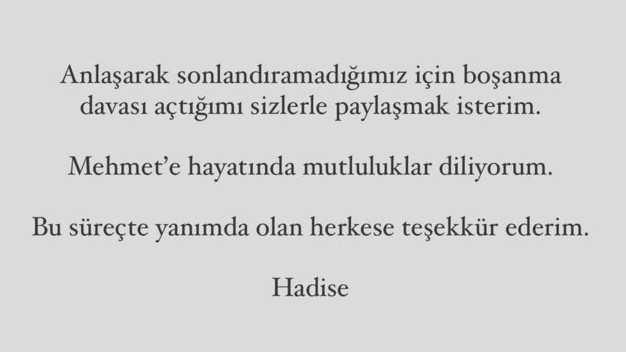Beş aylık evliliğini bitirme kararı alan ünlü şarkıcı Hadise yazılanların ve yapılan paylaşımların ardından sosyal medya hesabından bir paylaşım yaparak duruma açıklık getirdi. Beykoz Aile Mahkemesi’ne boşanma dilekçesi veren Hadise açıklamasında “anlaşarak sonlandıramadığımız için boşanma davası açtığımı sizlerle paylaşmak isterim. Mehmet’e hayatında mutluluklar diliyorum. Bu süreçte yanımda olan herkese teşekkür ederim” ifadelerini kullandı. Öbür taraftan ünlü isim Hadise’nin mahkemeye verdiği boşanma dilekçesindeki ifadeler de ortaya çıktı. Hadise’nin avukatı tarafından verilen dilekçede “Mehmet Dinçerler, evlendikten kısa bir süre sonra Hadise’nin sanat hayatını kısıtlayıcı tutum ve tavırlar sergilemeye başladı. Mehmet’in bu davranışları zaman içinde psikolojik baskı boyutu da vardı. Bu baskılar Hadise’yi yıpratmaya başladı. Sadece kişisel hayatını değil, sanat hayatını da etkileyecek boyuta vardı. Ayrı yaşamaya başlayan çiftin evliliği de fiilen bitti” ifadeleri kullanıldı.