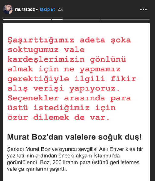 Geçtiğimiz haftalarda pop müziğin sevilen ismi Murat Boz ve oyuncu sevgilisi Aslı Enver alışveriş merkezinden çıkarken görüntülenmişti. Gazetecilerin önünde valeye 200 lira veren ve daha sonra vale şirketini arayıp para üstünü istediği iddia edilen Boz cimriliği ile manşet olmuştu. Dün akşam ise ünlü popçu Kuruçeşme'de bir balıkçıda yemek yedi. Çıkışta muhabirlerle konuşan Murat Boz'a sevgilisi Aslı Enver ve çok konuşulan bahşiş olayı soruldu. Ünlü şarkıcı konu hakkında neler söyledi?